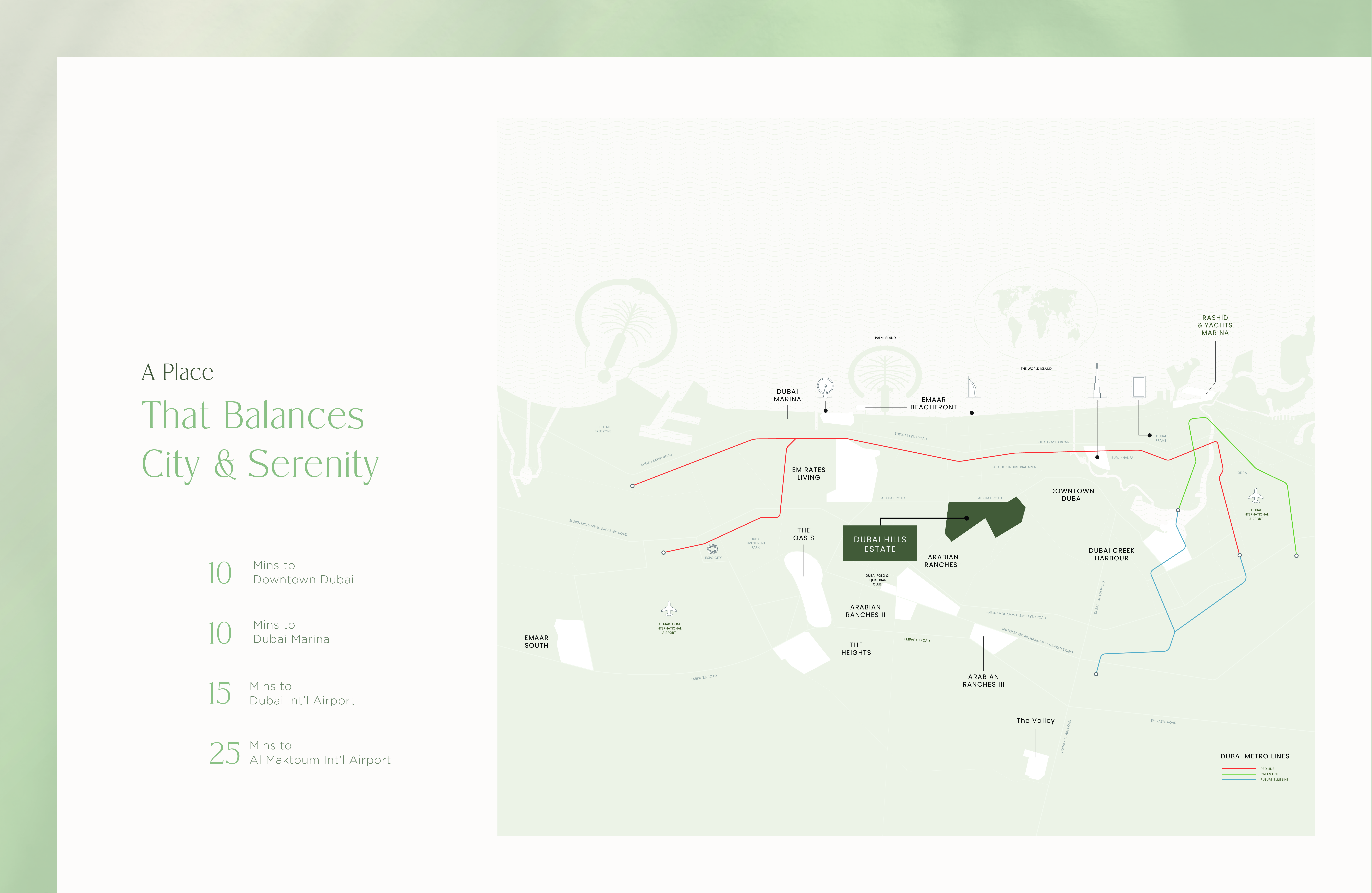 Dubai Hills Estate – the green heart of Dubai – is a first-of-its-kind destination. This masterfully planned, multi-purpose development forms an integral part of the Mohammed Bin Rashid City. Strategically situated between Downtown Dubai and Dubai Marina, flanked by Al Khail Road, the community offers easy access to the city’s most popular districts and attractions.